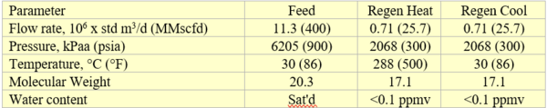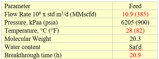 Chapter 18 of Gas Conditioning and Processing, Volume 2: The Equipment Modules (9th Edition) [2] contains equations that permit us to calculate the total mass of the molecular sieve, the Break Through Loading (BTL, or Useful Loading), and the aged net equilibrium loading. Using the assumptions listed above together with the equations in Chapter 18 it can be shown that: