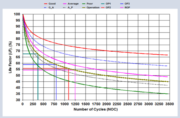 The difference between the predicted life using standby time shown by the Computer Model and the two manual methods is primarily due to the inherent inaccuracy of trying to interpolate and extrapolate data plotted on Figures 3 and 4. The computer model will produce the same result every time. This cannot be said when visually reading Figures 3 and 4. Figure 5 shows the output from the GCAP Computer Model [3]. Note that when working on one curve, the higher the calculated EOL FL, the fewer the Number of Cycles (NOC) remaining until the beds need to be replaced.