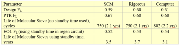 3. Interpolating and extrapolating from the PTR FL Point, we find the End of Life FL of 0.52 occurs around 1400 cycles (see Figure 4). Since 365 cycles have already occurred and going forward a reduced cycle time will be used, the molecular sieves are forecast to last a total of 3.5 years.
