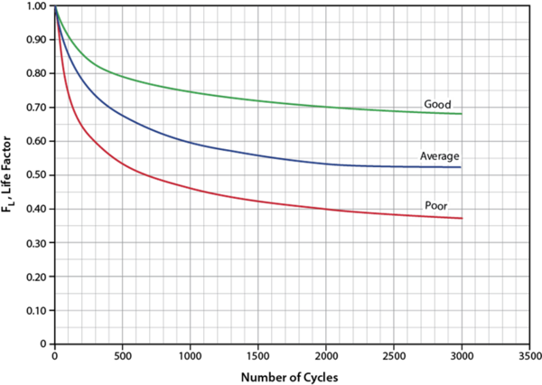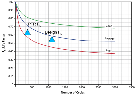 7. Because the PTR FL Point falls on a curve lower than the Design FL Point, we need to be concerned. Interpolating and extrapolating the capacity decline curve from the PTR FL Point, we see an FL of 0.67 (the Design FL) will occur after a total of about 750 cycles. This is approximately one year shorter than the expected life.