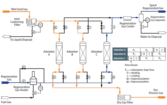 Figure 2. Typical process flow diagram for a 3-tower adsorption dehydration system [2]