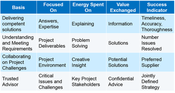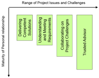 Developing a healthy relationship with all project stakeholders, especially the client and/or project owner, helps them accept your credibility when passing on good or bad news. Without a good relationship, your news can evoke skepticism or even hostility. All relationships are built on trust and run at different “levels”. At the beginning level, the basis of the relationship focuses simply on answers. At the deepest level, the players share concern for critical project issues and challenges.