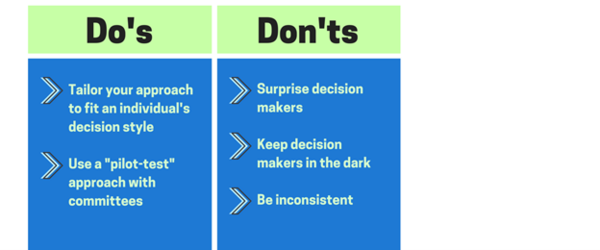 Use a “pilot test-type” method for a decision board or committee. Here’s how it works. The project manager meets with one or two decision makers at a time. He or she lays out the facts of the situation with a "what do you think" approach. This allows for: