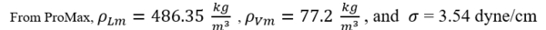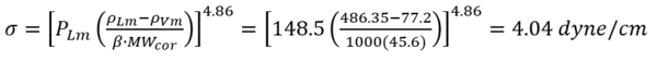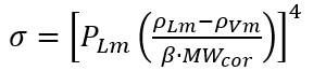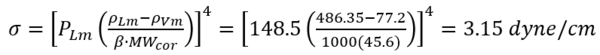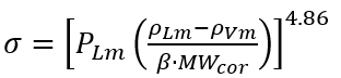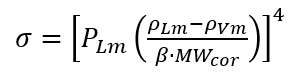 The surface tension of a liquid mixture is not a simple function of the surface tensions of the pure components because, in a mixture, the composition of the surface is not the same as that of the bulk. Typically, we know the bulk composition but not the surface composition [2]. Section 12-5 of reference [2] provides details of the liquid mixtures surface tensions estimation procedures. In this TOTM a semi-empirical approach based on the Macleod [3] basic relationship (Eq. 1) for  as a function of liquid mixture Parachor, PLm , and the liquid, PLm , and vapor, PVm , densities in kg/m3 (lbm/ft3).
