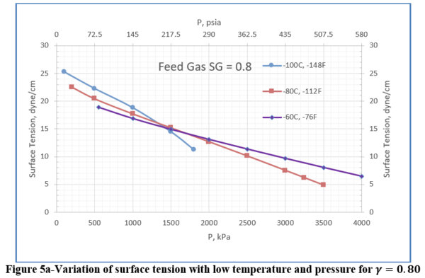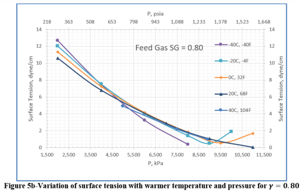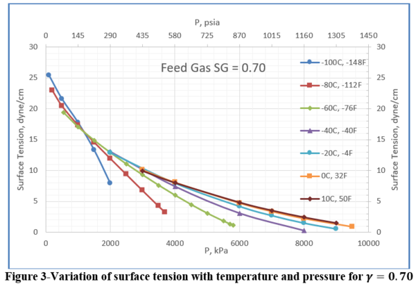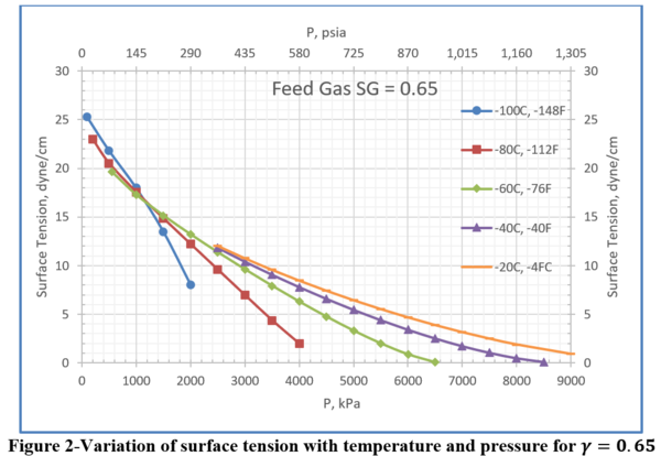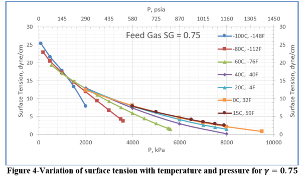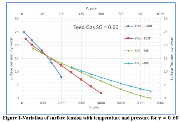 Using the SRK-EOS option in ProMax [4], generated Figures 1 – 5 to estimate liquids mixtures surface tensions, , as a function of temperature and pressure at a specified feed gas relative density in the range of 0.6 to 0.8.  Please note that these charts may be used to estimate liquid hydrocarbon surface tension if their inlet gas composition is close to that to one of the compositions listed in Table 1, finding the appropriate surface tension chart, and then read of surface tension at the temperature and pressure of interest.  In addition, the accuracy of a semi empirical approach based on the Macleod [3] basic relationship (Eq. 1) to estimate  was evaluated against the surface tension values calculated by ProMax [4]. The summary of the error analyses in Tables 2 and 3 indicate that a considerable accuracy improvement is obtained by replacing the original exponent of 4 in Eq. 1 with 4.86.