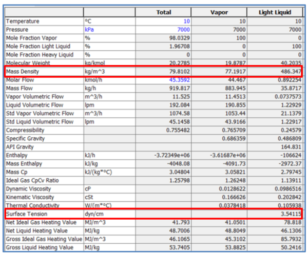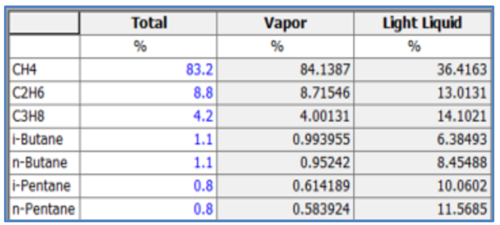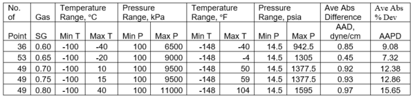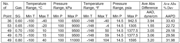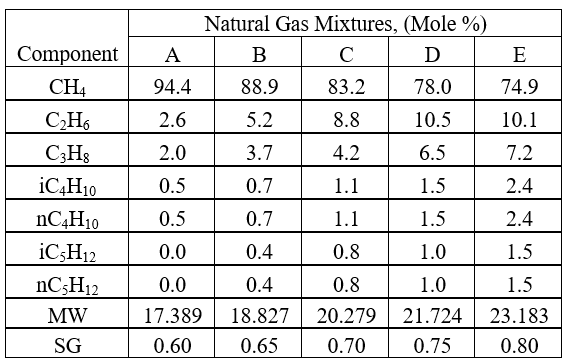To evaluate the accuracy Eqs. 1-4, the SRK EOS option in ProMax [4] was used to generate the liquid mixture surface tension,  for various values of pressure, temperature, and feed natural gas relative density.  The total number of  values calculated was 236. Table 1 presents the composition of five different natural gas feed mixtures with gas relative densities of 0.60-0.80 used in this study. To generate the data used for this TOTM, the feed gas composition was flashed at various temperatures and pressures to be within the two-phase region to generate the liquid hydrocarbon mixture that would be in equilibrium with the gas phase at said conditions. As a result, the total combined composition of the vapor and the liquid are fixed by the feed composition.  For each surface tension data point, the vapor and liquid compositions and densities change depending upon the temperature and pressure conditions of the flash calculation. Given the number of data points generated in this TOTM (236), an example of a flash calculation result from ProMax, and the resulting liquid surface tension estimation using the equation provided and the accuracy is compared to the ProMax program output.