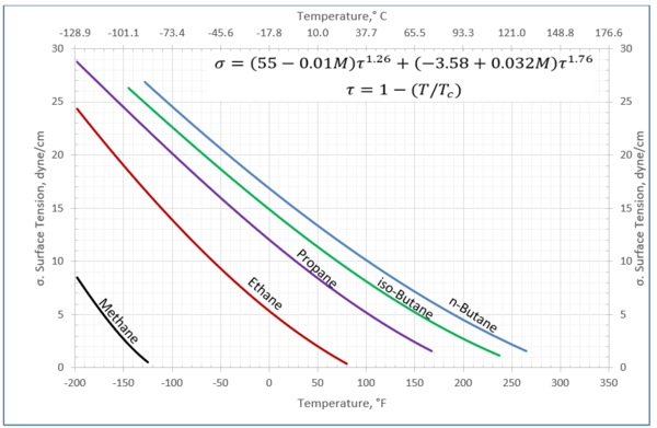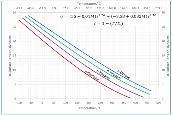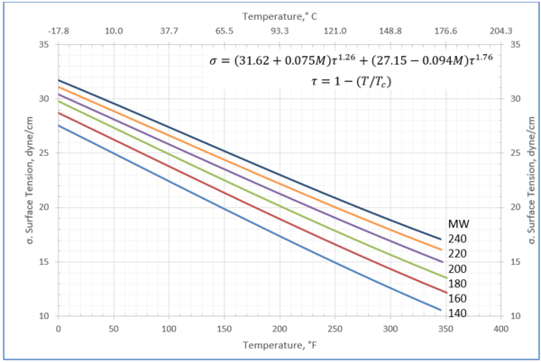 Romero-Martinez and Trejo [3] presented a new correlation scheme for the surface tension of homologous series of pure liquid hydrocarbons, as a function of molecular weight and temperature. Using orthobaric surface tension data from literature for four homologous series of hydrocarbons, i.e., Paraffins, Olefins, Naphthenes, and Aromatics, they obtained individually adjustable parameters for two new surface tension equations.