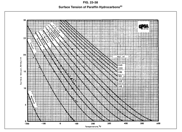 The GPSA Engineering Data Book [1] presented Figure 23-38 (provided on the last page) for estimation of the surface tension for pure methane, C1, through n-octane, nC8, and the heavy ends with molecular weights of 140 to 240.