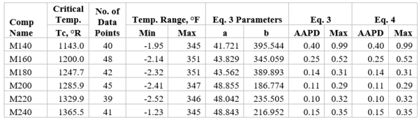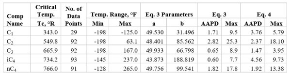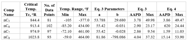 Table 1b presents the accuracy of Eqs. 3 & 4 against limited n-butane experimental values [2]. Similarly, Table 2b presents the accuracy of Eqs. 3 & 4 against limited n-heptane experimental values. For all points tested in these two tables the absolute percent deviations (APD) from the experimental values are less than 3.42 % and 1.3% for Eqs. 3 and 4, respectively.