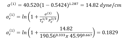 The units in Eqs. 7 A and B are bar (Pc), kelvin (Tc), and dyne/cm (). To use this method, for the fluid of interest is related to for the two reference fluids, methane (1) and n-octane (2) by