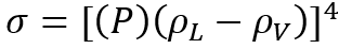 The details of estimation methods for surface tensions of both pure liquids and liquid mixtures are presented in chapter 12 of The Properties of Gases and Liquids [2]. Equation 1 presents the basic relationship for as a function of Parachor number, P, and the liquid, , and vapor, , densities: