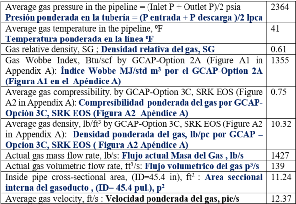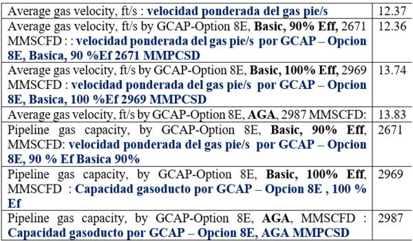 La metodología aplicada arriba demuestra como los gasoductos de larga distancia con correlaciones/líneas de gas, aplicando (ecuaciones BASIC and AGA ) pueden ser aplicadas en la evaluación de los gastos de diseño . Se notó que la Ecuación Básica con 90 % de eficiencia reflejo los resultados medidos en capacidades muy cercana con ecuación básica con eficiencia de 90 %. Fue notado que la ecuación Básica con 90 % reprodujo con mucha cercanía los resultados medidos de las citadas líneas de flujo.