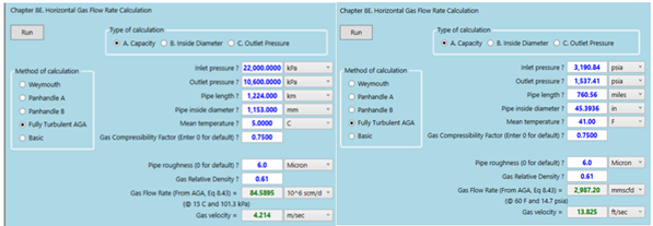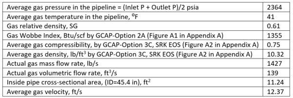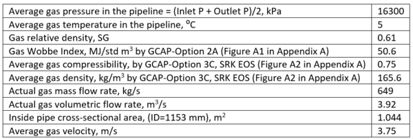 Where P is the average pressure between inlet (22000 kPa or 3190 psia) and outlet (10600 kPa or 1537 psia) pressures amounting to 16300 kPa (23663 psia), T is the average temperature in the pipeline (5 ⁰C=41°F or 278 K=500.4 °R), Z is the average compressibility of 0.75 and R is the universal gas constant (8.314 kPa.m3/kmol. K or 10.732 psia.ft3/lbmol-°R).