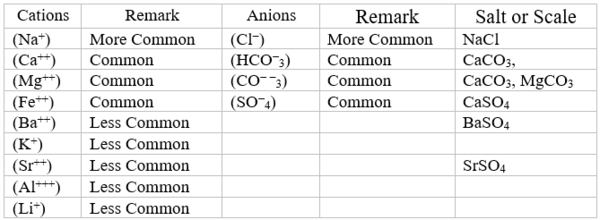 For example, seawater with a small concentration of Strontium (Sr++), no Barium (Ba++) but high concentration of Sulfate (). On the other hand, a high salinity produced water has no Sulfate () but a high concentration of Strontium (Sr++) and Barium (Ba++). If these two waters are kept separately, they do not form scale, but if they are mixed cause severe Barium Sulfate (BaSO4) and Strontium Sulfate (SrSO4) scale formations.