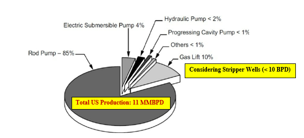 The total producing well count in the USA is at an estimated number of 950,000 wells, which produce some 11 MMBPD of oil, and 96 BCF/D of gas, Artificial Lift is applied in approximately 50 % of these wells. Gas Lift installations account for some 10 % of all Artificial Lift applications, assuming Stripper Wells (less than 10 BPD) are included, or some 50,000 active Gas-Lift wells in the USA.