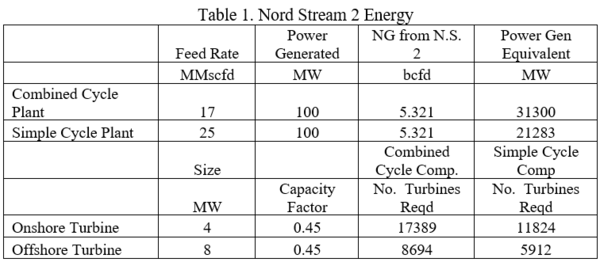 To quantify the amount of energy that N.S. 2 could transport, let’s burn the natural gas in modern power generation facilities to convert that energy into MW for a comparison with wind turbines. The pipeline would have transported roughly 5.321 billion std. cubic feet per day of natural gas.