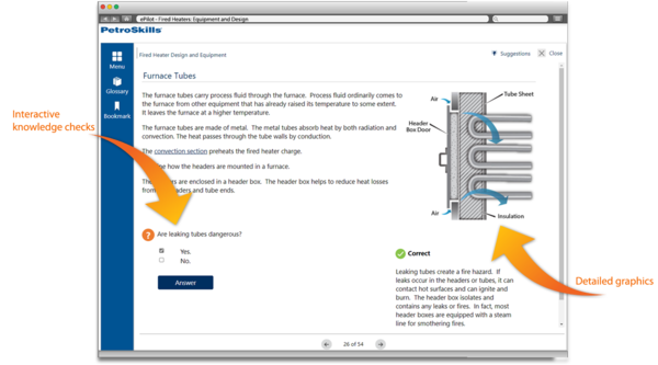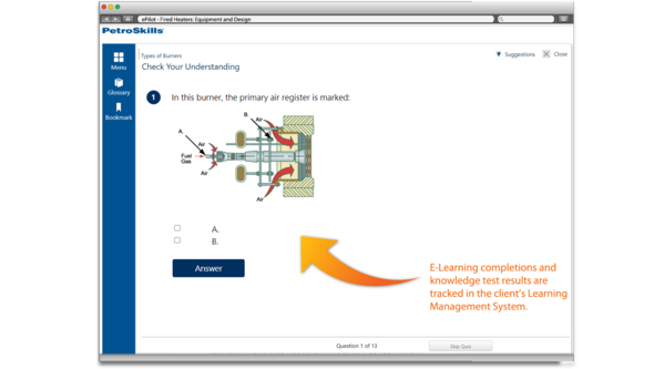 For the first transition, the SMEs liked the PetroSkills eLearning better than others they had access to. Two PetroSkills ePilot courses on fired heaters covered the general awareness and knowledge level learning they had been covering with face-to-face. They also discussed creating customer eLearning content with PetroSkills based on existing courses, but decided to use the two PetroSkills eLearning courses in their existing form. The added benefits of using the ePilot programs were the ability to track completions in their corporate learning management system (LMS), to test knowledge, and for operators to do the elearnings on-shift, eliminating the need to train on off-days with overtime pay.