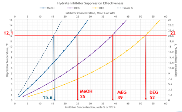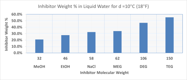 The lower the molecular weight of a thermodynamic inhibitor, the better the hydrate suppression performance. For example, in glycols MEG has better performance characteristics than DEG, and methanol MeOH will outperform ethanol EtOH. In Part 1 of this tip of the month (November 2020 TOTM [1]) provided insight into the relative performance of hydrate inhibitors, and discussed the limitations, pros and cons of the various options. Part 1 demonstrated that for a hydrate depression temperature of 10oC (18oF) to prevent hydrates formation in our gathering system the required concentration of inhibitor in the liquid water phase using the Nielsen and Bucklin [2] equation is 13 mole %. Figure 1 provides the corresponding weight % of the various inhibitors that would be required for this depression temperature (d). As shown in Figure 1, the inhibitors weight % is a function of molecular weight shown on the horizontal axes.