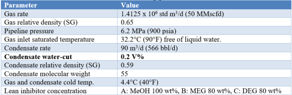 To determine the impact of the water-cut of the condensate on the inhibitor injection requirement, one needs to calculate the mass of additional water this adds to the pipeline. The additional water is estimated as follows: