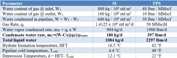 The water content of lean sweet natural gas is a function of temperature and pressure and can be estimated from the charts in chapter 6 of volume 1 of Gas Conditioning and Processing [4]. The water content of the gas at the inlet and outlet of pipeline are used to the determine the amount of condensed water in the. The liquid water associated with watercut should be added to the condensed water. The total liquid water is a first key factor that establishes the amount of hydrate inhibitor required. Likewise, the hydrate formation temperature (HFT) is a function of pressure and relative density of gas and can be estimated from the chart in reference [4]. The second key factor is the required depression temperature (d=HFT-Tcold). The HFT is an important parameter for determination of the depression temperature. The summary of preliminary calculation results is presented in Table 2.