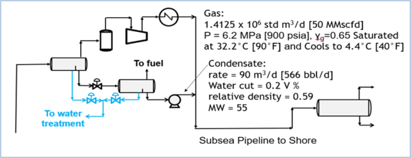 To prepare a hydrate prevention program for the subsea pipeline, let us consider a multiphase subsea pipeline transporting gas and condensate from an offshore production facility to shore. The flow rates and pipeline conditions are provided in Table 1 and Figure 2. The feed condensate to pipeline water-cut is 0.2 volume percent. The solubility of methanol to the hydrocarbon liquid phase is a strong function of both the water phase concentration of inhibitor, but also the hydrocarbon phase composition. The previous case study assumed that the condensate that was separated on the platform was bone-dry when it was pumped into the pipeline with the gas phase. This tip of the month is going to focus on the impact of water-cut in the condensate on the inhibitor injection rates. As with the previous case study, for the methanol injection estimates, we will include both the vapor and liquid hydrocarbon losses.
