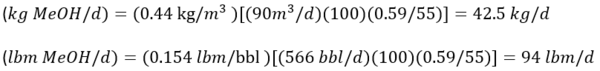 (lbm MeOH/d) = 84 300 (50) (0.0019) (0.156) = 1250 lbm/d