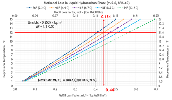 From Figure 6 for depression temperature, d = 12.1 °C (22 °F), the required MeOH loss factor is 0.44 kg/m3 (0.154 lbm/bbl). For a condensate rate of 90 m3/d (566 bbl/d), relative density of ɣ = 0.59 and molecular weight of MW = 55, calculate rate of MeOH loss to liquid hydrocarbon phase by equation 3.