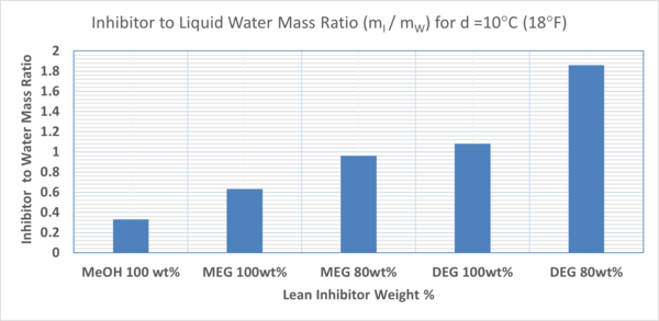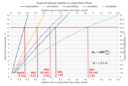 From Figure 4 at the same depression temperature, the required mass ratio, (mI / mW), for lean MeOH 100 %, MEG 100 wt% and DEG 100 wt%, are 0.33%, 0.63% and 1.08, respectively; and for MEG 80 wt% and DEG 80 wt%, are 0.96% and 1.86, respectively.