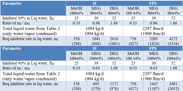 From Figure 4 for depression temperature, d = 12.1 °C (22 °F), the required ratio of mass of inhibitor in the liquid water phase to mass of condensed water, (mI / mW) for three inhibitors are determined and shown in Table 3. The required inhibitor rate in liquid water phase, mI, the fourth key factor, can be calculated by equation 2.