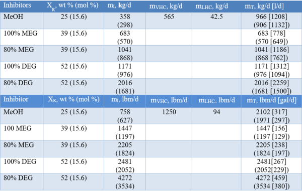 The inhibitors injection rate in parentheses are for the case of excluding condensate entrained liquid water.