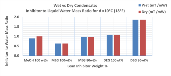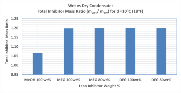 Figure 9 - Comparison of total required inhibitors injection ratio to prevent hydrate formation for wet (water-cut 0.2 vol%) and bone-dry (water-cut 0.0 vol%) condensate.