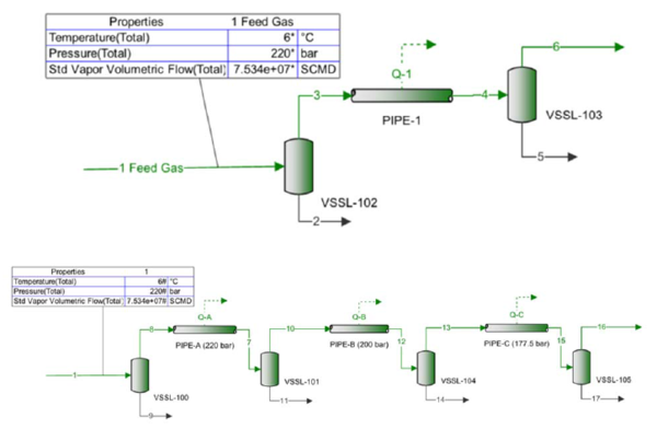 The two PFDs shown in Figure 3 were simulated using ProMax [8] for the feed compositions shown in Table 1 and the design conditions. The summary of pipeline specifications is shown in Tables 2 and 3.