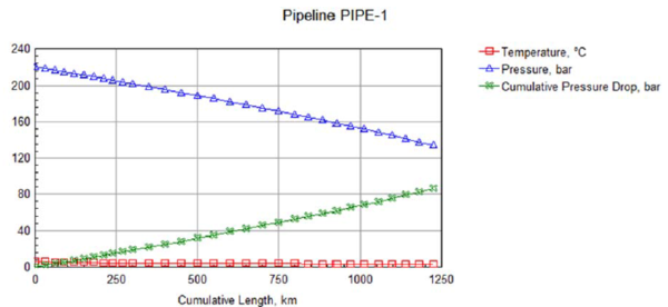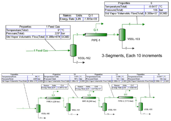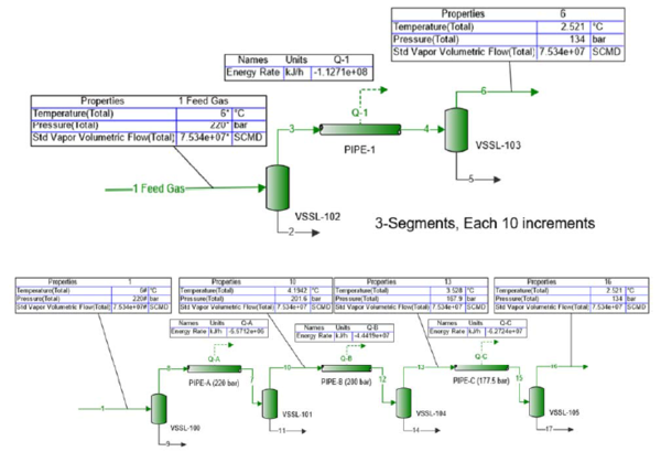 The process flow diagram (PFD) for this case study is shown in Figure 3. The pipeline outlet pressure must end up in the dense gas phase region. The pressure listing in bar for PIPE-A, PIPE-B, and PIPE-C indicate the maximum allowable working pressure for each segment.