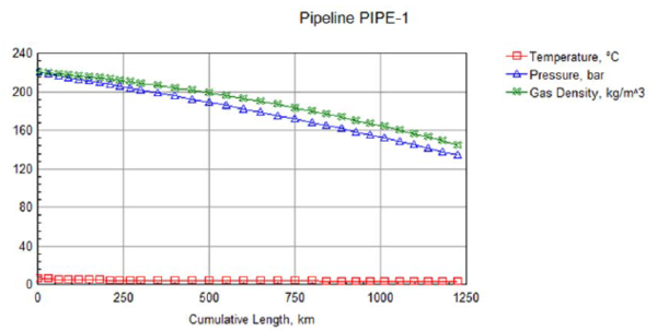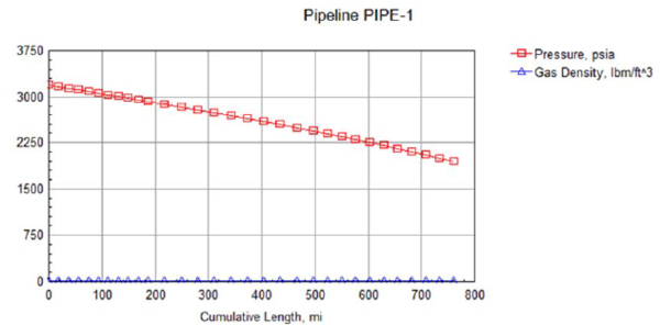 Note that in Figure 6 the pressure varies from 3 190 psia to 1 943 psia (from 220 to134 bara) and the gas density varies from 13.7 lbm/ft3 to 9.0 lbm/ft3 (from 220 to 144.6 kg/m3).