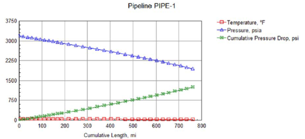 Figure 5 – Variation of temperature, pressure, and cumulative pressure drop along the whole length of pipeline.