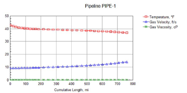 Figure 7 indicates that as the line pressure declines, velocity increase from 9.25 ft/sec to 14.96 ft/s (2.82 to 4.29 m/s) due to the decline in gas density. Recall, the mass rate and the crosssectional area of the pipeline are constant. Thus, as the gas density decreases, the velocity in the pipeline increases. The gas viscosity varies from 0.025 to 0.017 cP, but the line temperature cools down from 42.8 °F (6 °C) to 36.5 °F (2.5 °C) due heat transfer between the pipeline and the subsea environment and includes the J-T expansion effect.