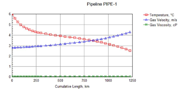 Variation of temperature, pressure, cumulative pressure drops, gas density, viscosity, velocity along the whole length of pipeline is shown in Figures 5 through 8.