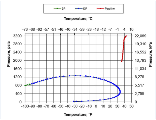 Figure 8 shows the pipeline pressure-temperature profile and feed gas phase envelope. The inlet condition: pressure of 3 190 psia (220 bara) and temperature of 42.8 °F (6 °C) while the outlet condition show: pressure of 1 943 psia (134 bara) and temperature of 36.5 °F (2.5 °C) are also indicated.