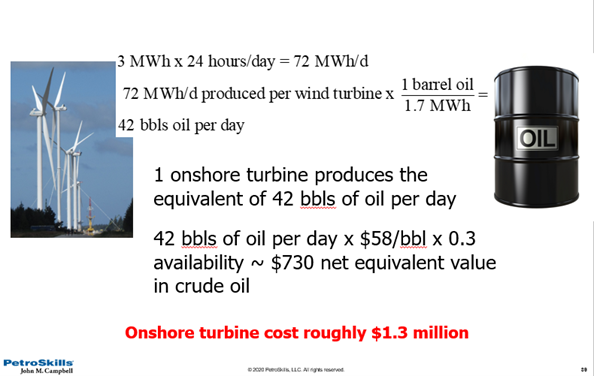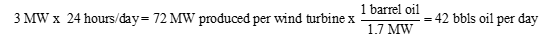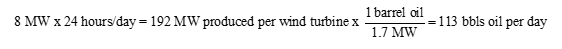 Assuming a typical onshore wind turbine with a 3 MegaWatt (MW) capacity and 40% efficiency (on the high end), that turbine would produce a net equivalent of 17 barrels of oil per day. Note the Betz Limit is the physics boundary for a wind turbine, the maximum efficiency a turbine could capture is roughly 60% of the kinetic energy from wind) [8]. This calculation assumes 1 bbl of oil is equivalent to 1.7 MW of energy, which is a typical value for a 22 API crude. Assuming the wind blew 24 hours a day (overly optimistic), said wind turbine would produce 17 bbls oil per day. See conversion and Figure 6 below.