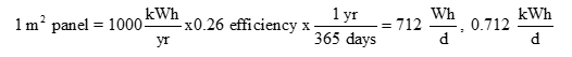 Solar power is hard to give a definitive energy parity conversion to, as it is strongly dependent upon where the panels are installed and what the average radiation levels are at that location. Assuming a square meter panel has a 1000 kWh/year generation per square meter and a 26% efficiency (typical), it will generate roughly 710 Wh per day [10]. It should be noted that the physical limit of PV efficiency is the Shockley Queisser Limit which is 34% [8]. See conversion below: